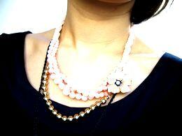 淡いピンクのビーズの3連ツイストやゴールド×ブラックのカラーの組合せがラブリー。