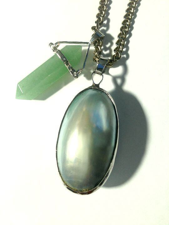 自然そのままの色が美しい、天然石とシェルを使った2トップのロングネックレス。すべてビンテージパーツ&チェーン。アベンチュリンのグリーンと両表のシェルパーツの色合いが美しいです。チェーンもトップのボリュームに負けない、太いタイプのチェーン。Tシャツにさりげなくあわせて・・・。