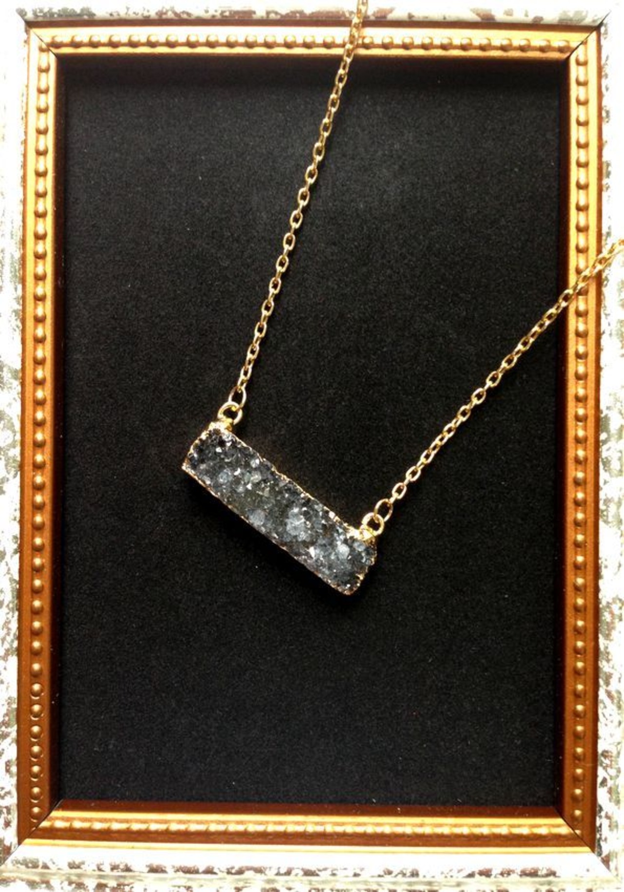 自然のカタチそのままが美しい、カルセドニー(瑪瑙)の結晶のペンダントトップがついたプチネックレス。ペンダントトップはスモーキーなブラックが印象的。そしてあえての横長で差のつくデザイン。80年代の良質なチェーンと合わせました。「ドゥルージー」とは、鉱石の結晶のこと。